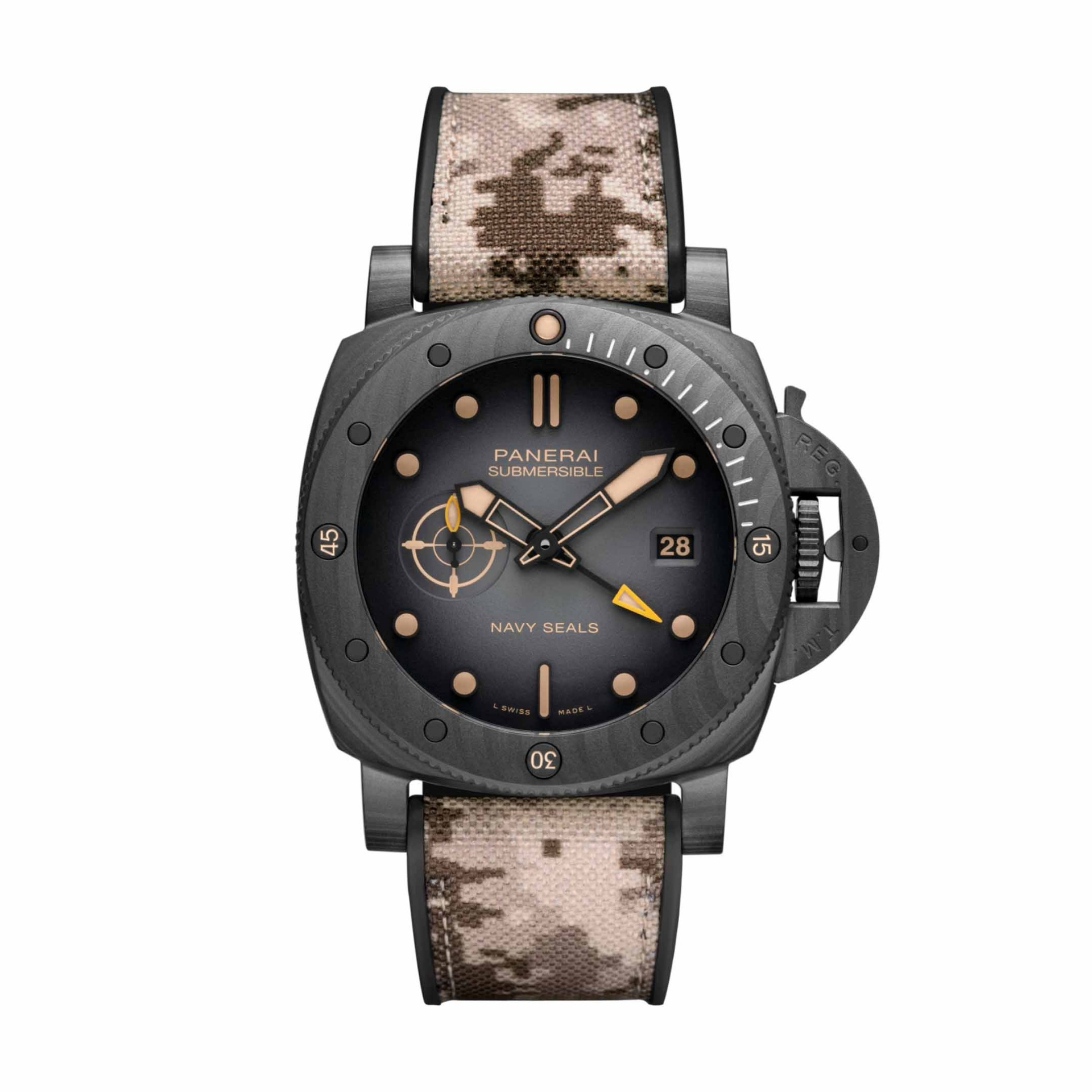 Dotato di funzione GMT, permette di monitorare due fusi orari contemporaneamente, perfetto per viaggiatori e professionisti. La cassa da 44 mm offre una presenza importante al polso, mentre il design Navy SEALs richiama un’estetica militare elegante e moderna.